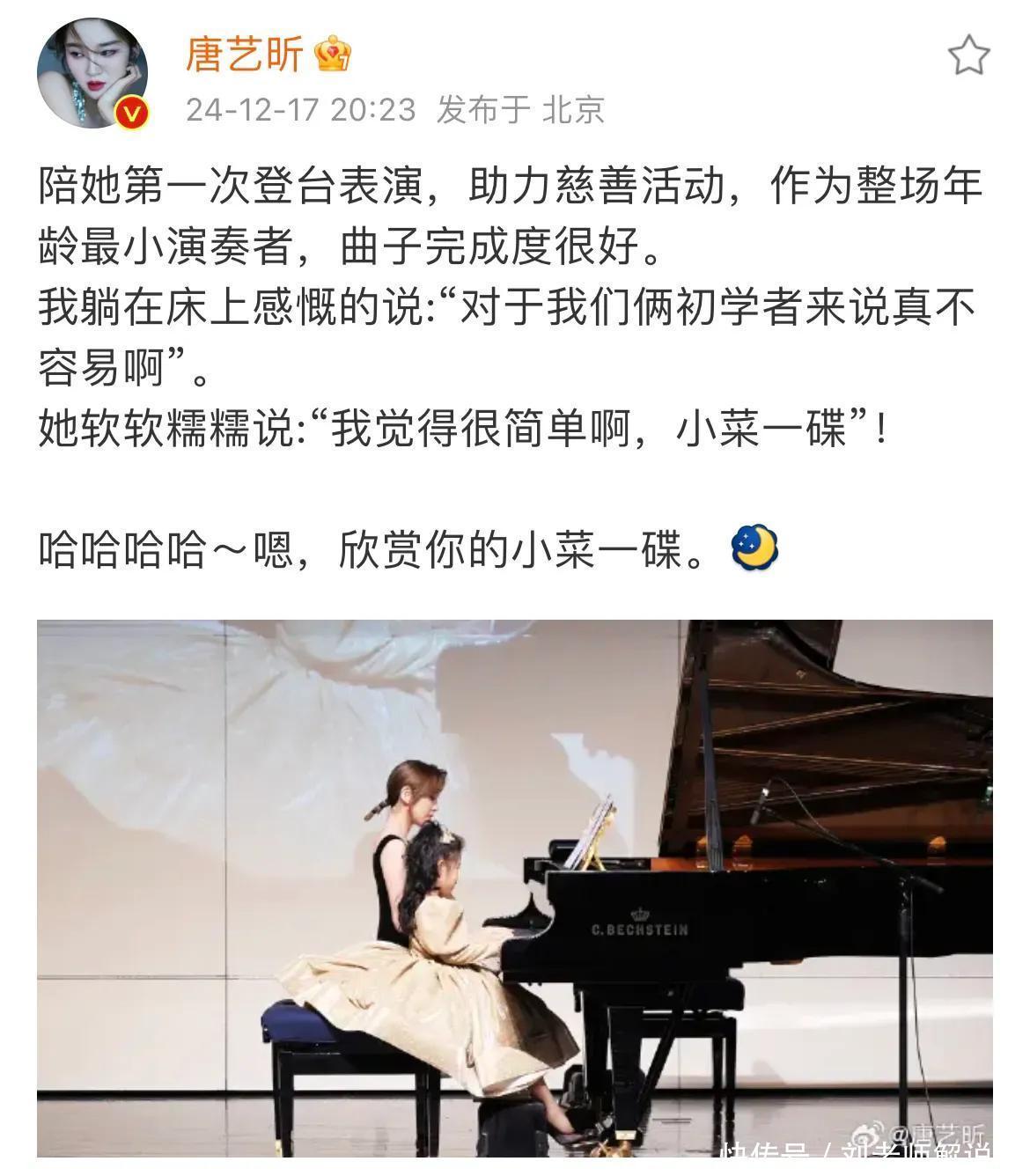 12月17日,唐艺昕在社交平台晒出和女儿一起登台演奏钢琴的照片,母女同框好有爱。