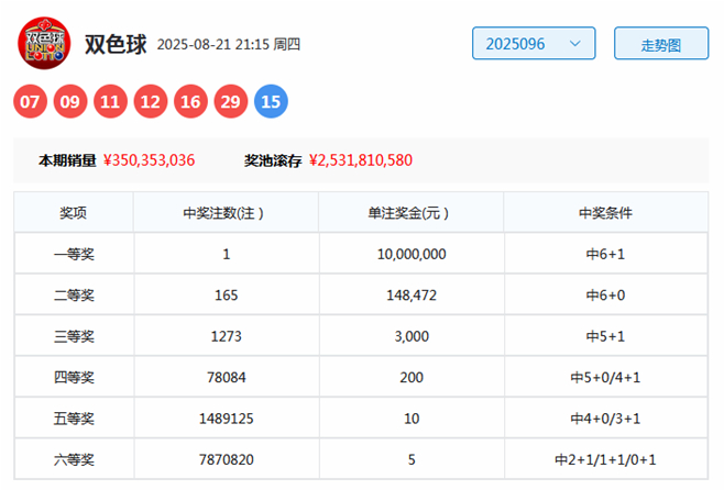 双色球第2025096期奖号为:07、09、11、12、16、29+15。